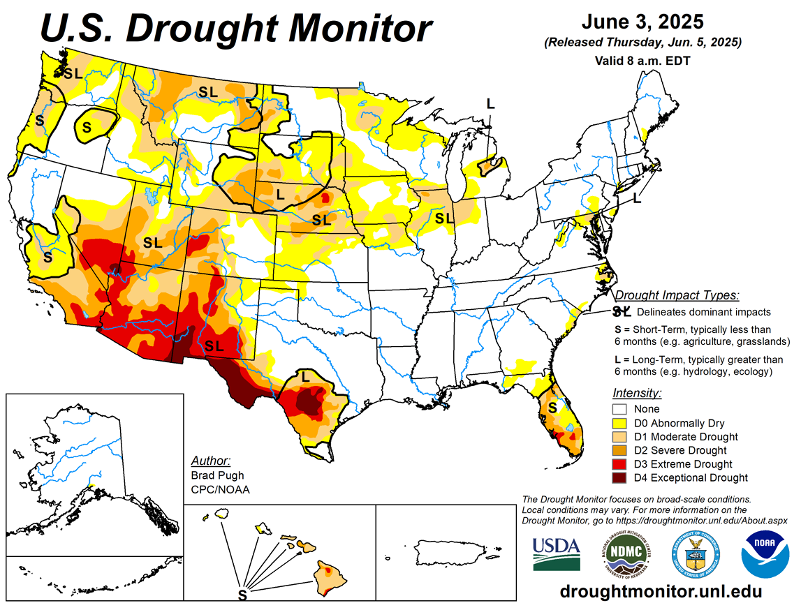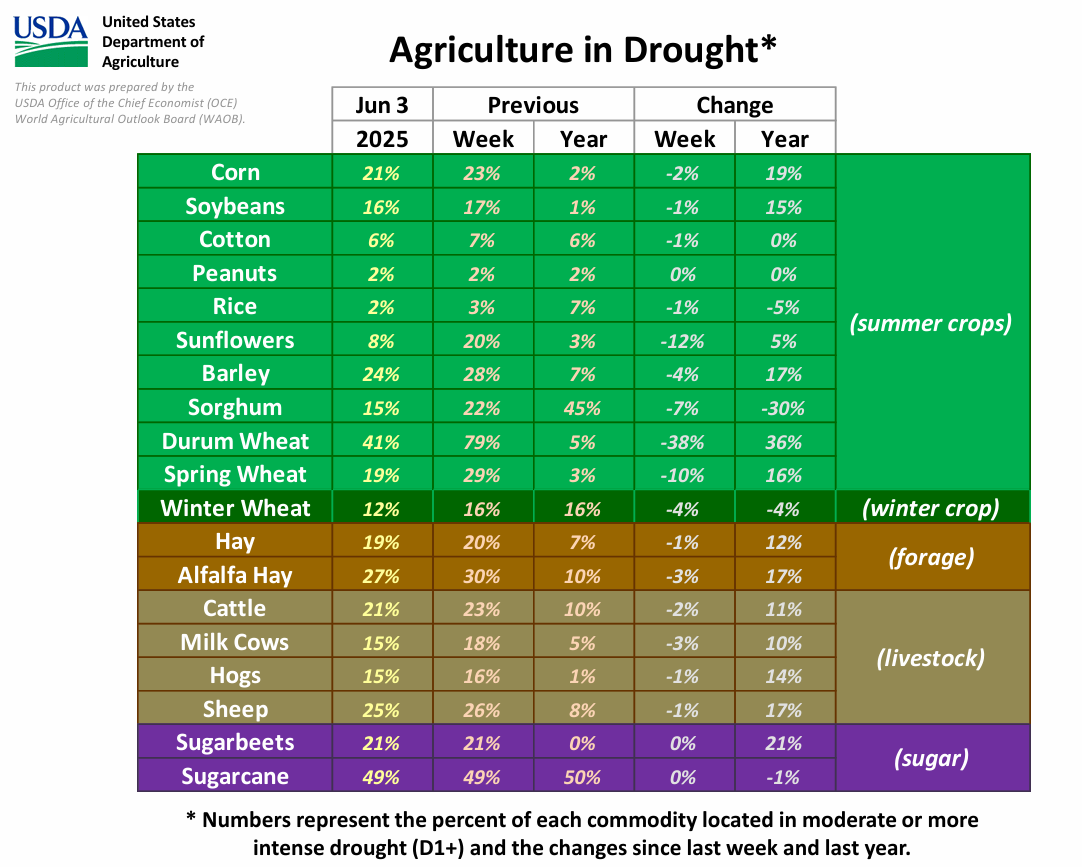根据美国农业部(USDA)经济首席办公室(OCE)及世界农业展望委员会(WAOB)于2025年6月5日发布的最新《农业干旱报告》显示,截至2025年6月3日,美国多个主要农产品产区正经历中度至更严重级别的干旱(D1+)。该报告基于美国干旱监测系统的数据配资公司电话,并结合了NASS 2022年农业普查数据进行分析。揭示了干旱对谷物、经济作物及畜牧业的显著影响: